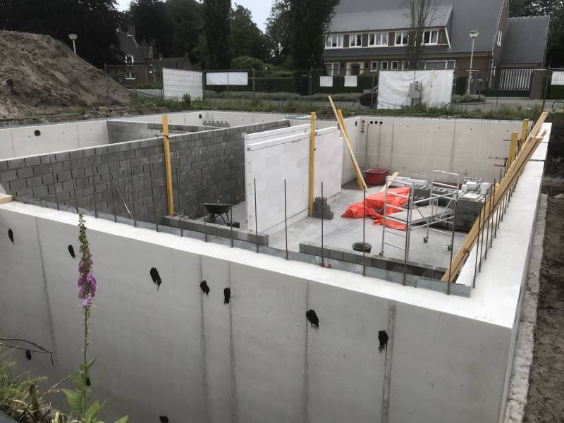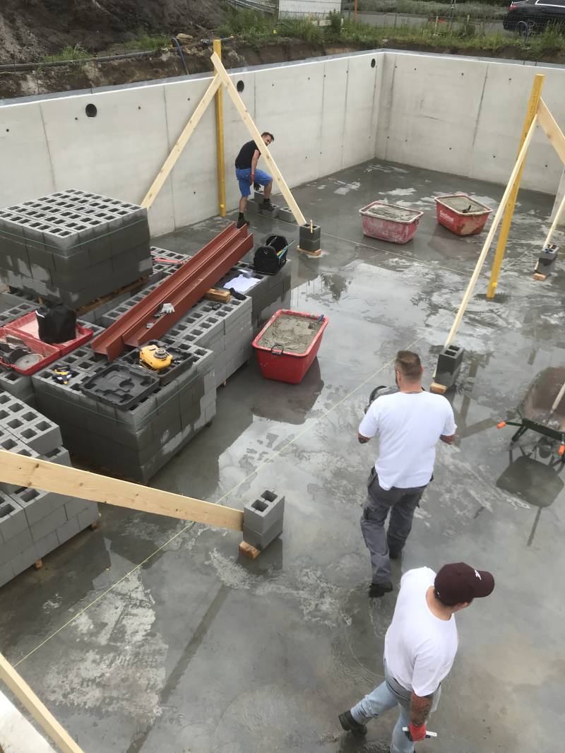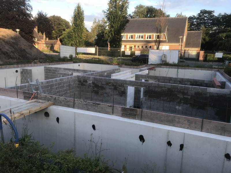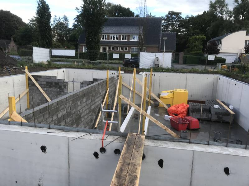 Vroeg in de ochtend werden de eerste bouwmaterialen op de werf geleverd. 1056 Betonblokken en 800 Liter mortel werd in de (nog "kale") kelder neergezet. Daar kwamen "mijn" werkmannen (Niko, Steven en Jelle) met volle moed en "jeukende handen" aangewandeld. Het eerste "werkje" van de dag was de kelder leegpompen, aangezien het enkele dagen voordien had geregend stonden we met ons schoenen in het water. Omstreeks 8u30 begonnen ze met het uitmeten van de muren en het plaatsen van profielen, even later was HET moment aangebroken en plaatste Niko de eerste steen. Het beloofde een warme dag te worden. Met geen zuchtje wind en stenen van 14,6 kg werd het "zwoegen en zweten". Ik vertrok op de werf om zo mijn werkdag te starten, schuldgevoel overheerste. Ik zag 3 mensen "zich uit de naad werken" voor mij, en ik kon niet blijven om hen bij te staan. Maar... de plicht riep, zonder inkomen ook geen huis, dus ik vertrok met een klein beetje tegenzin om mijn dag vol afspraken af te werken. Echter had ik nog 1 verzoek. Op vraag van mijn overleden grootmoeder werd er traditiegetrouw een palmtakje ingemetseld.De palmtak staat symbool als overwinning na een lijdensweg en zou volgens mijn grootmoeder "geluk" brengen. Op het moment dat dit gebeurde kreeg ik een foto doorgestuurd en kon ik geruststellend mijn werkdag verder zetten...