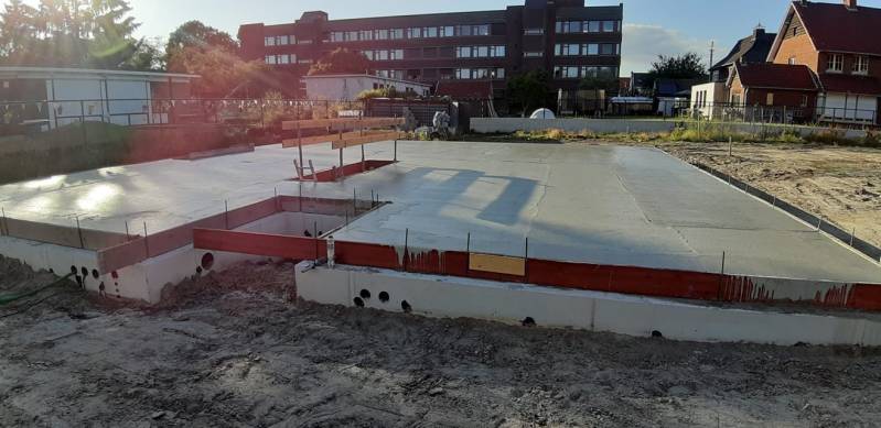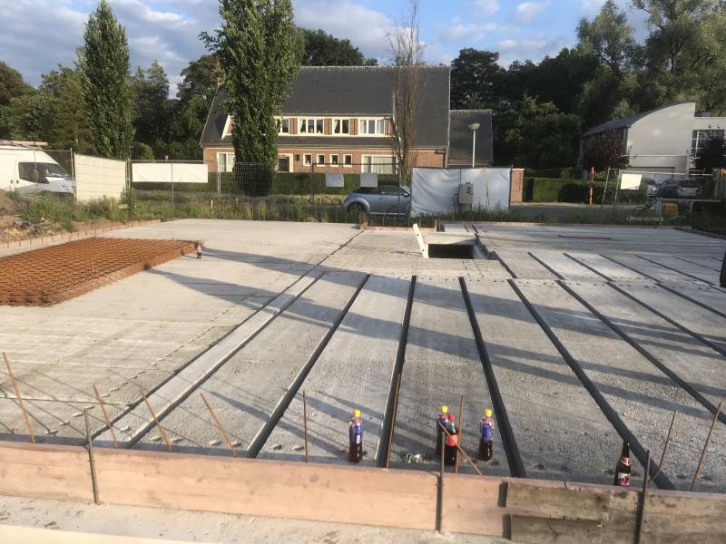 Het volgende op het lijstje was de gewelven nameten en bestellen. Ik koos voor de kelder gladde gewelven, om een industriële look te bekomen en zo pleisterwerken uit te sparen. Gladde gewelven zijn wel iets duurder dan ruwe, maar deze meerprijs weegt niet op tenopzichte van pleisterwerken. Mits er een grotere overspanning was ging de dikte van de gewelven van 13cm naar 17cm, de gewelven werden besteld bij Fingo, een gekende firma in deze regio.
